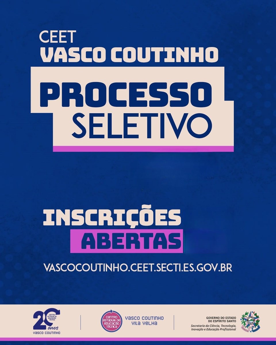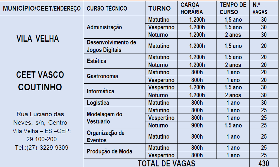 O edital contempla oportunidades em várias cidades capixabas, e o CEET Vasco Coutinho, em Vila Velha, está com 430 vagas distribuídas em 09(nove) cursos para o primeiro semestre letivo de 2026.